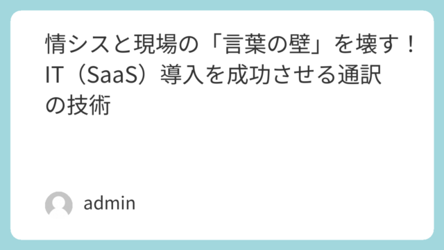 バックオフィス効率化 情シスと現場の「言葉の壁」を壊す!IT(SaaS)導入を成功させる通訳の技術 SaaS導入が失敗する最大の理由は「言葉の壁」にあります。情シスの専門用語と現場のエクセル信仰。この断絶を潜在意識のレベルから解き明かし、情報を資産に変えるための「通訳術」を解説。現状維持という退歩を止め、社内に変革の旋風を巻き起こしましょう。 2026.03.04 バックオフィス効率化